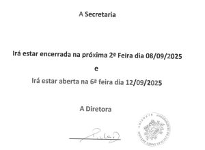 Informa-se que a Secretaria do Agrupamento estará encerrada na próxima segunda-feira, dia 08 de setembro de 2025, e funcionará no dia 12 de setembro de 2025 (sexta-feira).